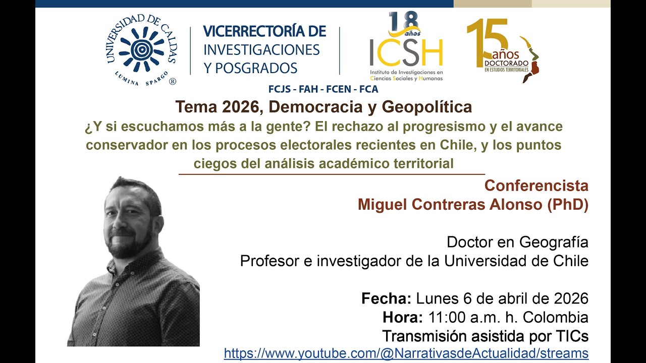 La Universidad de Caldas y el Doctorado en Estudios Territoriales se complacen en anunciar la participación del experto internacional Carlos Vladimir Zambrano (PhD), gracias al valioso respaldo de la Convocatoria Expertos Internacionales 2025 de ICETEX. Durante el año 2025, el profesor Zambrano acompañó actividades académicas relacionadas con el curso Territorios,...