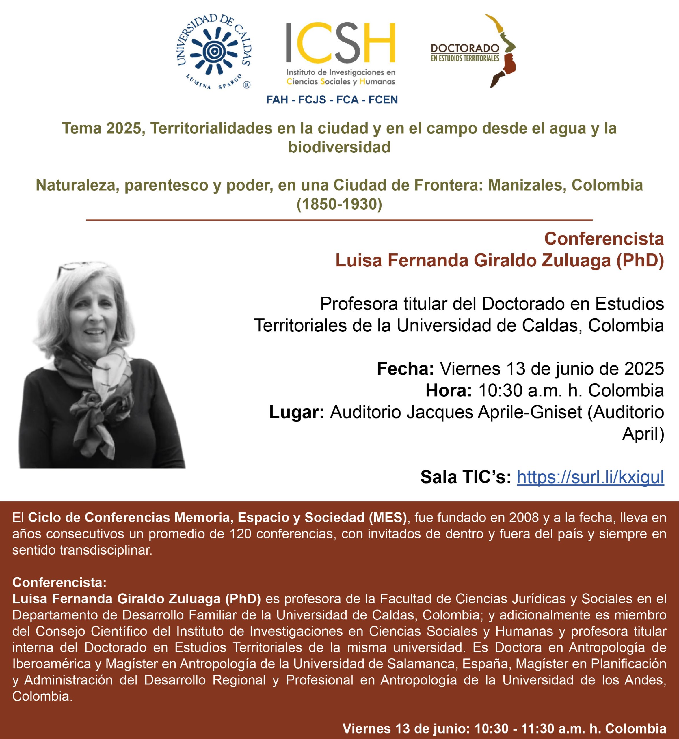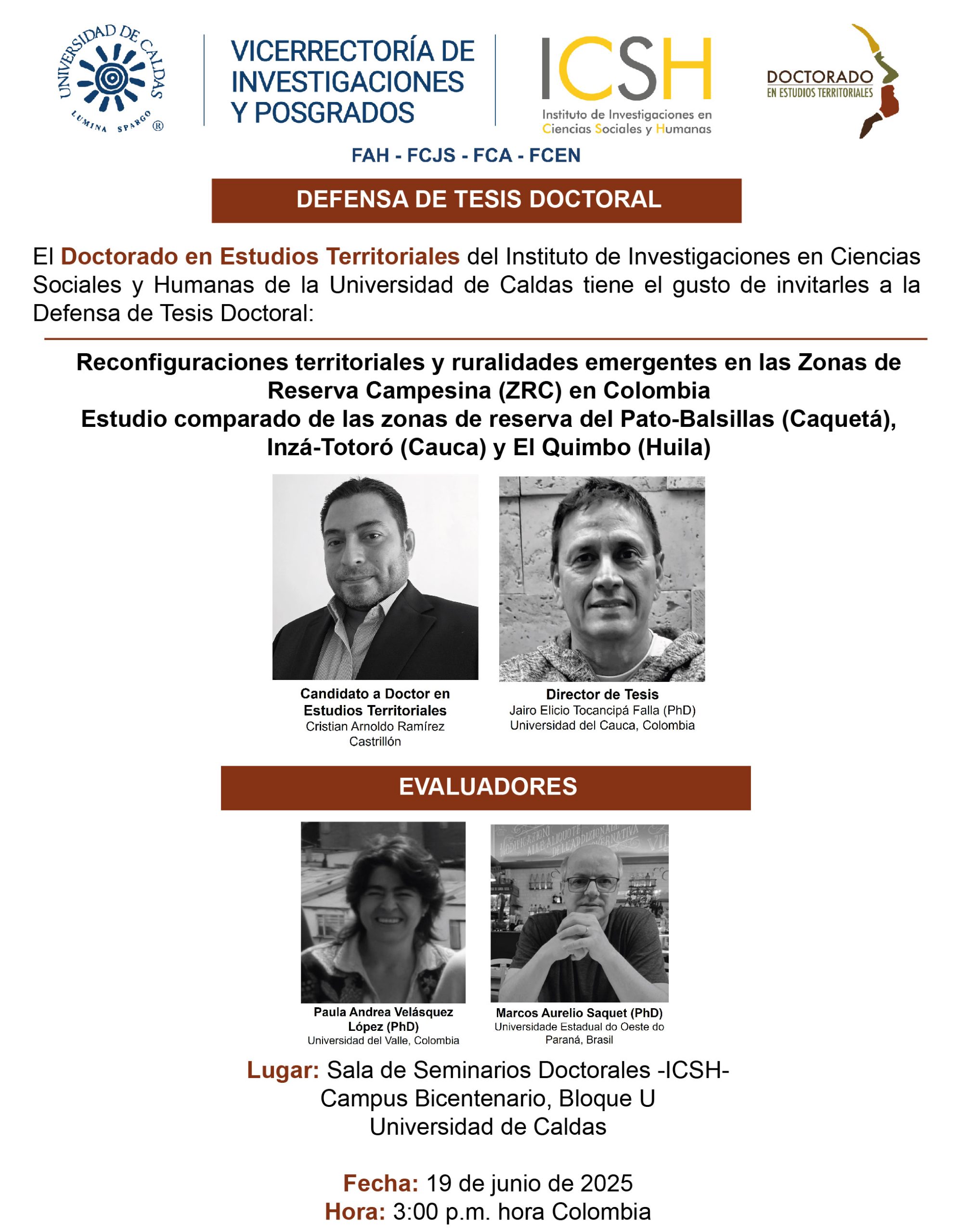 La Maestría en Estudios Territoriales de la Universidad de Caldas tiene el gusto de invitarles a la Defensa de Tesis de Maestría: “Lugar de pensamiento y actuación de los maestros rurales en la configuración territorial de dos Centros Poblados Urbanos en Medio Rural (CPUR)” Maestrante: Yeimi Paola Delgado Directora:...